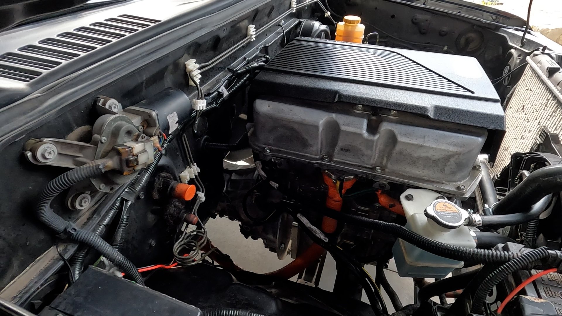 Under the hood, the original combustion engine is gone. In its place sits the Leaf “stack” motor and inverter, mounted cleanly with far more open space than the truck had before. One of the best parts of this setup is how approachable it looks. Anyone who has worked on 90’s trucks knows how cramped an engine bay can feel. This conversion opens it up. The wiring, cooling lines, and mounting points are easy to follow. It doesn’t feel intimidating or improvised, it feels serviceable and sane.