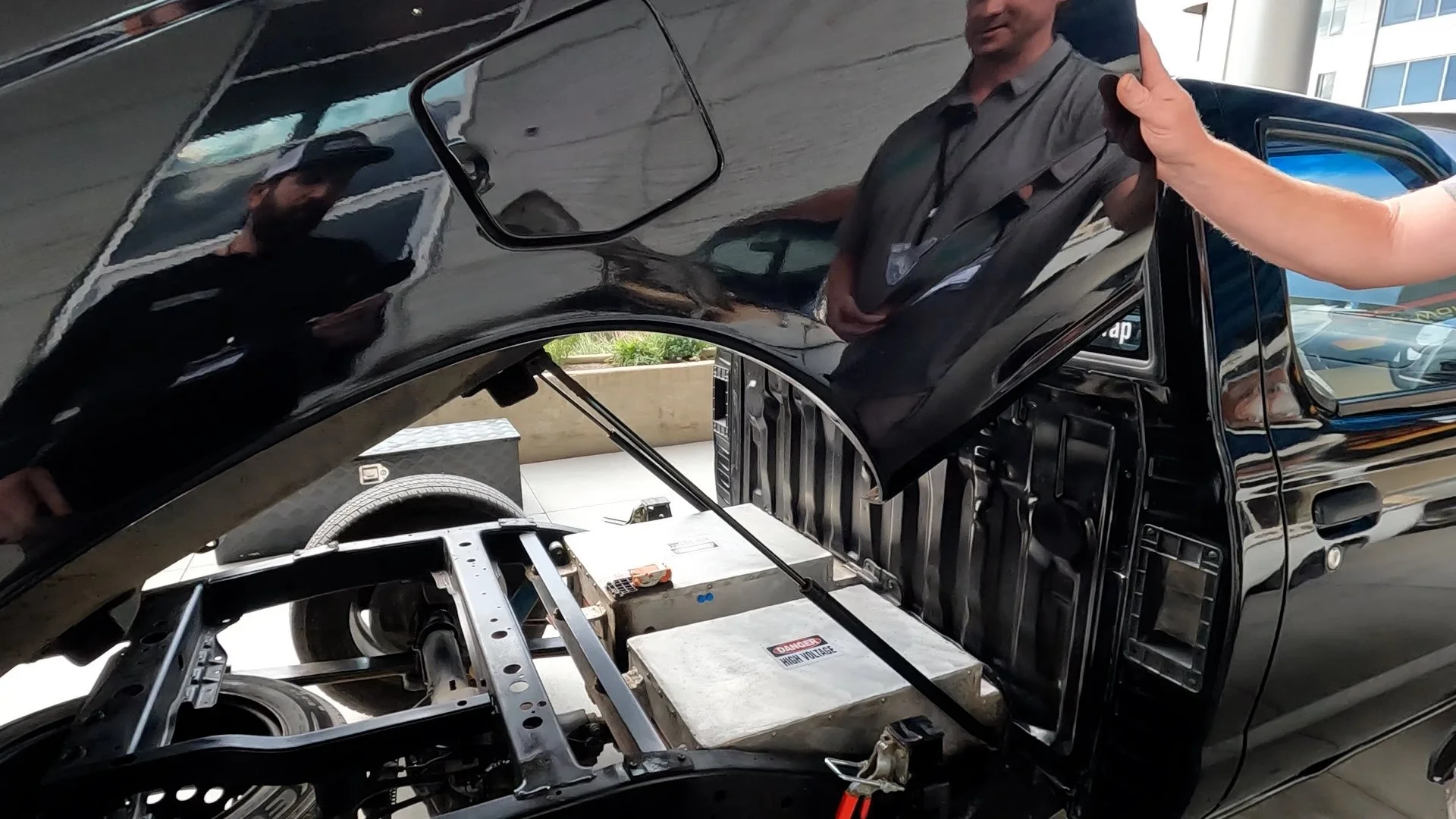 The battery system is one of the highlights of the build. The packs are mounted beneath the truck bed in custom-fit enclosures, and the bed can tilt upward to reveal the entire battery pack. This makes inspection and future service incredibly straightforward. The boxes were originally designed in CAD (read: Cardboard Aided Design), and final fitment left only an inch or so on each side. That’s a normal part of any EV swap, and solving those challenges is where craftsmanship and ingenuity shows through. The final layout is clean, protected, and well integrated.